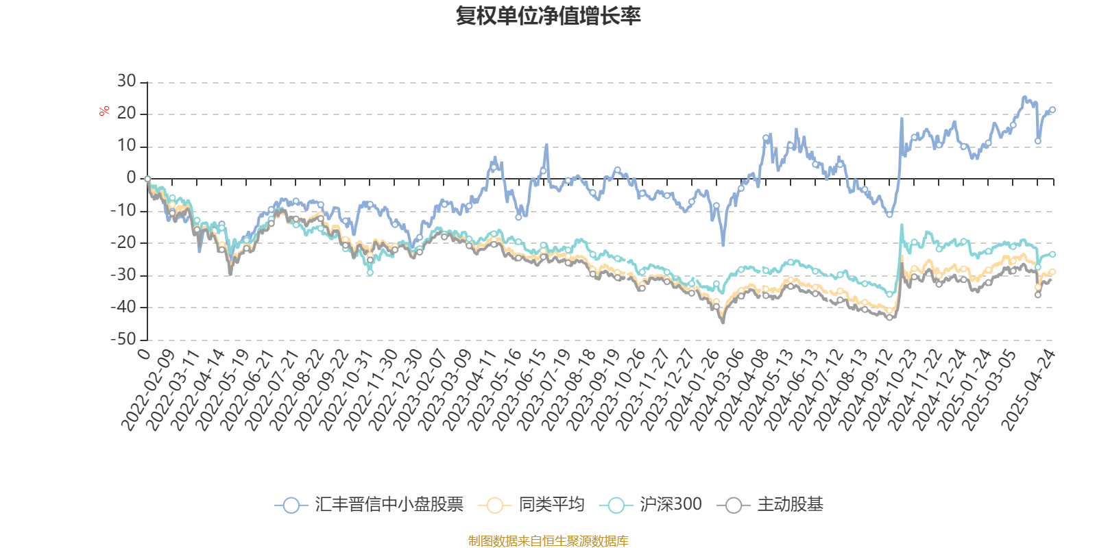 截至4月24日,汇丰晋信中小盘股票近三个月复权单位净值增长率为9.23%,位于同类可比基金10/166;近半年复权单位净值增长率为8.58%,位于同类可比基金20/166;近一年复权单位净值增长率为16.78%,位于同类可比基金42/165;近三年复权单位净值增长率为52.10%,位于同类可比基金2/156。