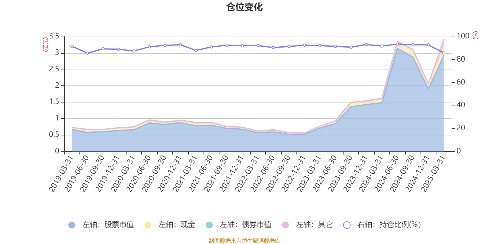据定期报告数据统计,近三年平均股票仓位为91.55%,同类平均为88.14%。2024年上半年末基金达到93.49%的最高仓位,2019年上半年末最低,为85.58%。