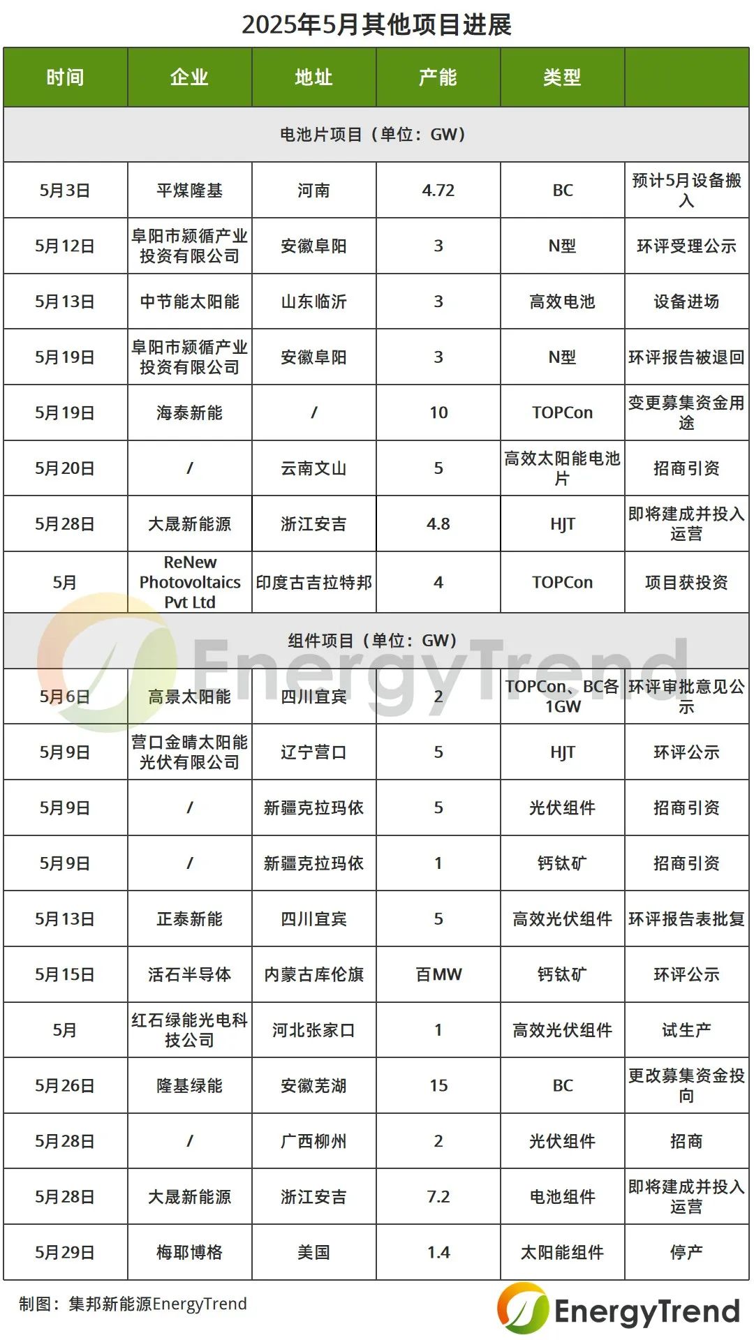 组件环节,5月6日,四川高景扩建年产2GW高效组件智能化项目环评审批意见公示,规划 TOPCon、BC 产能各1GW;5月9日,营口金晴5GW高效光伏异质结电池及组件项目(一期)环评公示;同日,新疆克拉玛依市发布5GW光伏组件和1GW钙钛矿太阳能光伏组件智能制造生产基地的招商引资消息;5月13日,正泰新能四川宜宾年产5GW高效光伏组件智能制造项目环评报告表获批复;5月15日,活石半导体北京百兆瓦钙钛矿光伏组件项目环评公示;同月,红石绿能光电科技公司河北张家口1GW高效光伏组件及配套产品自动化生产线进入试生产;5月26日,隆基绿能(601012)公告拟终止芜湖(二期)年产15GW单晶组件项目,转而投向铜川隆基12GW高效单晶电池项目;5月28日,广西柳州释放2GW光伏组件招商需求;大晟新能源安吉智能制造基地项目即将建成并投入运营,其中组件产能达7.2GW;梅耶博格关闭美国亚利桑那州1.4GW太阳能电池组件工厂。