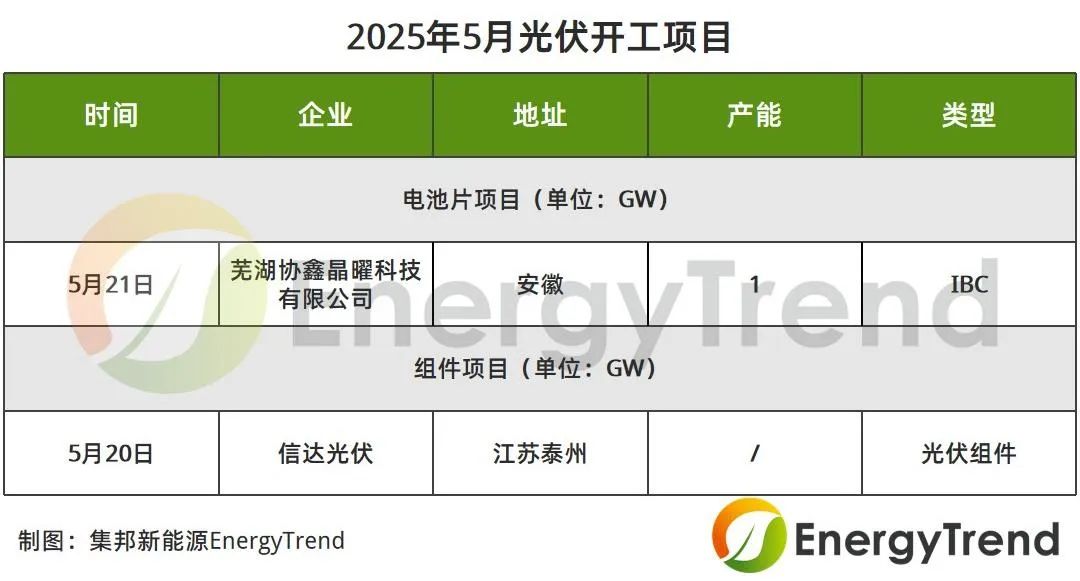 据集邦新能源不完全统计,2025年5月光伏开工项目共2个,分布在安徽、江苏两地,总投资13.3亿元。从具体环节来看,电池片环节开工规模为1GW,组件环节未披露具体规模。
